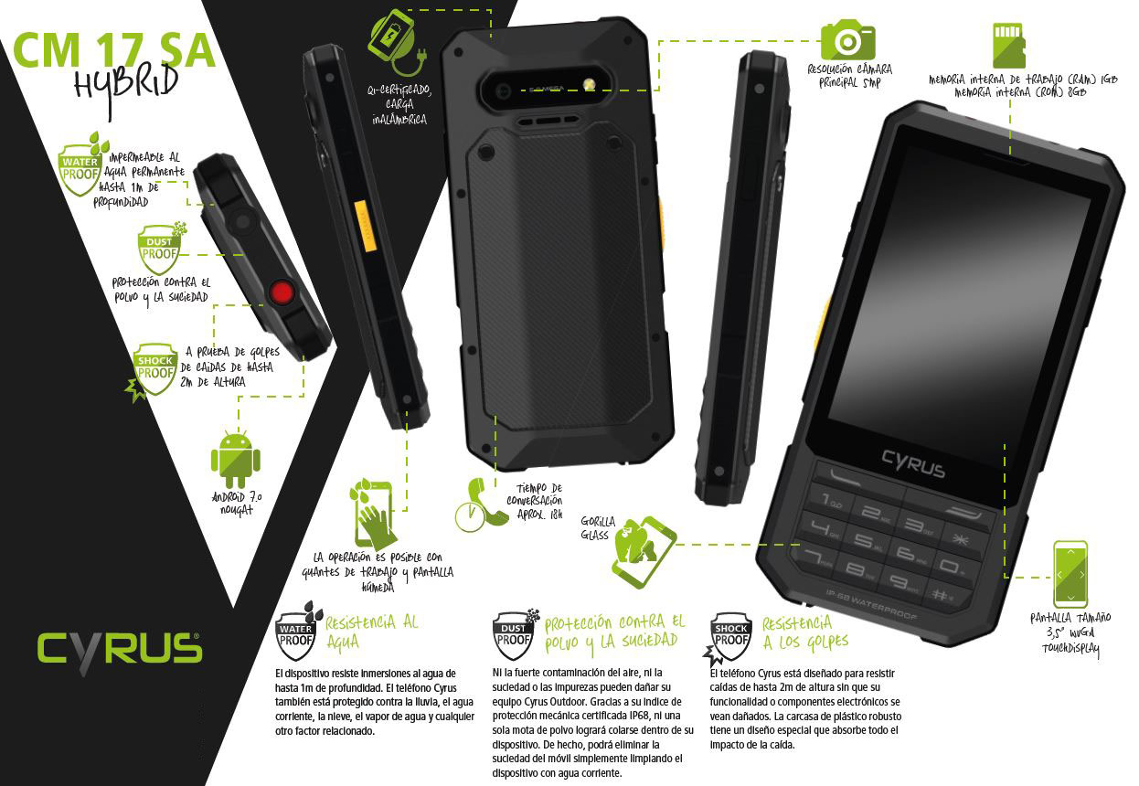 El Cyrus CM17 Hybrid es el primer celular de Cyrus en arribar a la Argentina y está pensado para usuarios expuestos a ambientes extremos, tanto por actividad profesional (obras en construcción) como por entretenimiento, por ejemplo en ciclismo de montaña.