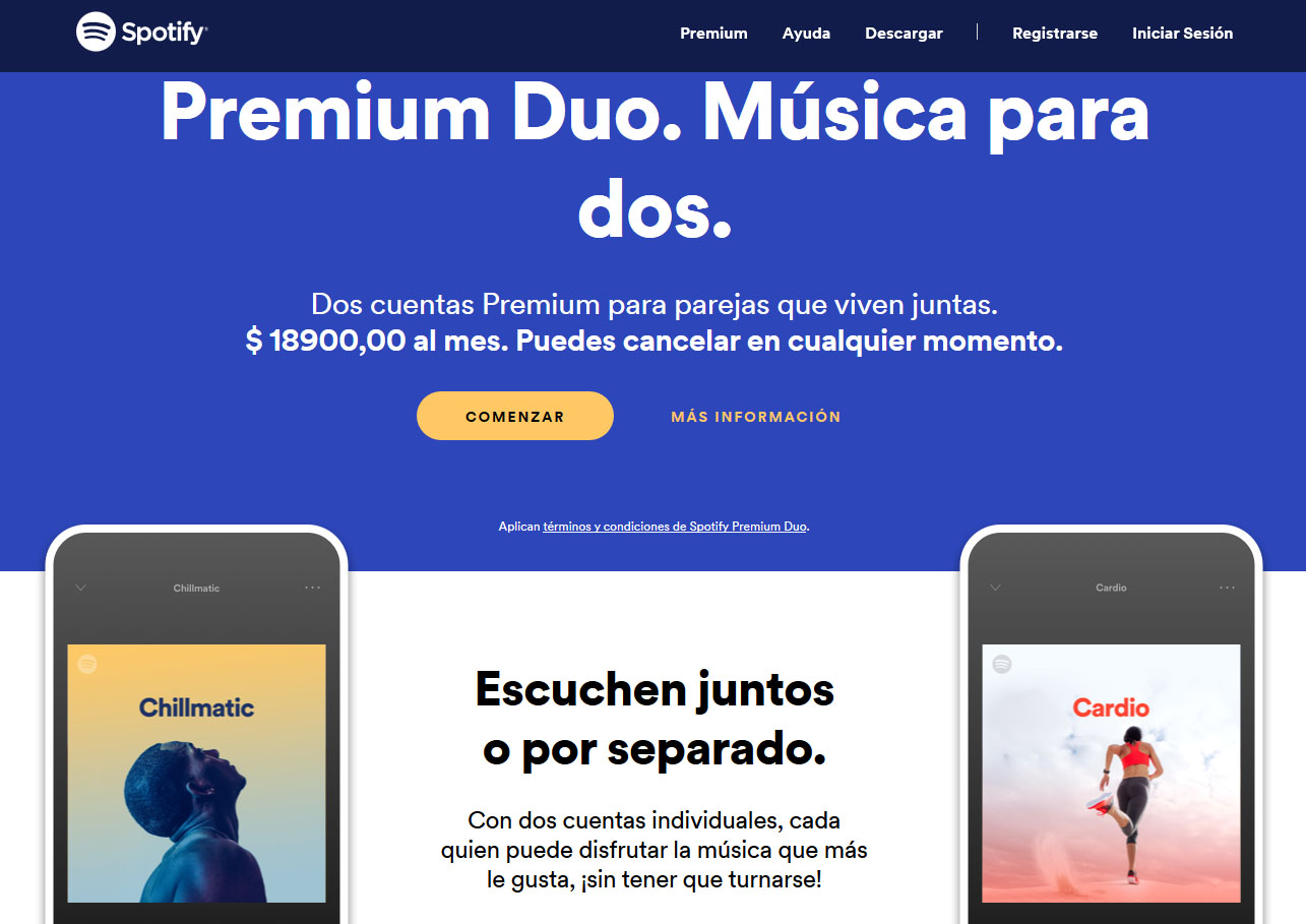 ¿Adiós a compartir una cuenta familiar entre amigos? Spotify presentó Premium Duo, para parejas que viven juntas: funciona en dos países de América Latina. Spotify puso en marcha Premium Duo, un plan pensado para que las parejas que viven juntas puedan compartir el acceso al servicio de streaming. Es más económico que el Plan Familiar y parece confirmar que combatirán el abuso que se hace al compartir cuentas: solicitarán la dirección en el proceso de registro.