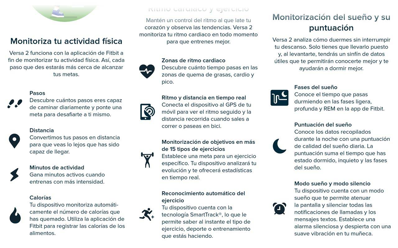 Además de resistir inmersiones de hasta 50 metros bajo el agua, el Versa 2 cuenta con Modo Reposo (para no ser molestado cuando se desee); Gráfica de Variación de Oxígeno Estimada (muestra un estimado de la variabilidad de los niveles de oxígeno en el flujo sanguíneo); y los clásicos rastreo de actividad automático, PurePulse con seguimiento del ritmo cardíaco, más de 15 modos de ejercicio con base en objetivos y, GPS conectado (depende del celular).